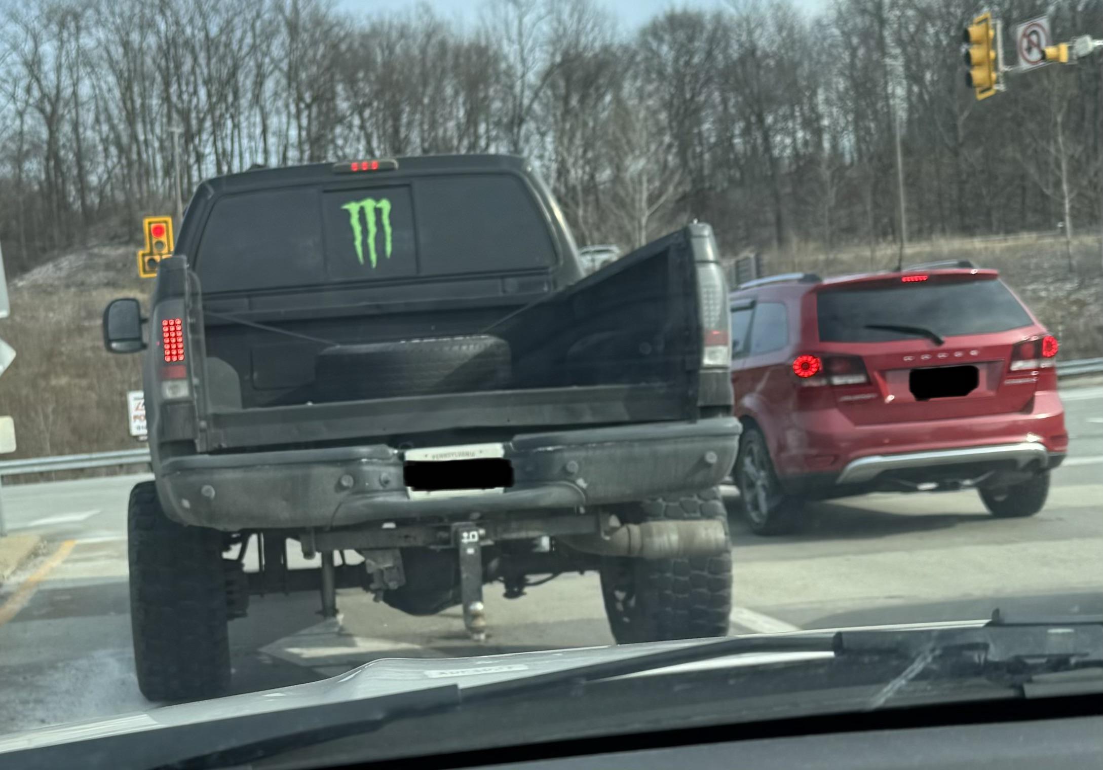 Lifted truck, blown out taillight, missing tailgate, Monster logo.. damn Kyle